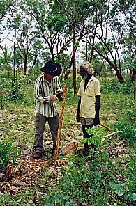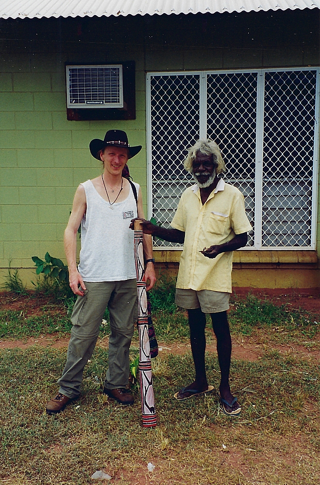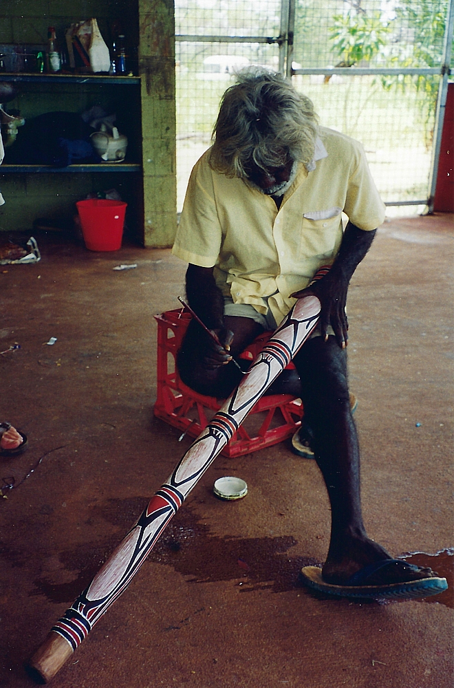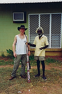 | Didge-Hunting im Bush um Wugullarr, den Stick hat Mad Matt noch und hält ihn in Ehren. | David Blanasi bemalt eins seiner Instrumente. Pinsel in Farbe - ein Strich. Wieder Pinsel in Farbe - wieder ein Strich | Und fertig isses, Mad Matt freut sich :-)